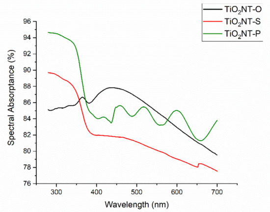 The absorptance spectra of the three materials are presented in Figure 4. The spectra for TiO2NT-S and TiO2NT-P have absorptance maxima in the UVB region. The absorptance values in the UV region of the spectrum of TiO2NT-O fluctuate slightly around the 85 to 86% range. The absence of UV absorptance maximum in the TiO2NT-O array has been attributed to the TiO2 cementing the tubes together possessing a mirror effect [57]. The calculated spectral absorptance values presented in Table 2, indicate that, despite some differences in the spectra, the overall absorptance is quite similar. Similarly, despite the visible portion of the spectra not showing any commonalities, the calculated absorptances are also very close. This might indicate that the optical properties of the materials have little bearing on their photocatalytic activity. For TiO2NT-S and TiO2NT-O the absorption of visible light decreased with an increase in wavelength. An absorption maximum was recorded for TiO2NT-O at 450 nm, which was followed by declining values. Oscillations in the visible region of the TiO2NT-P spectrum were recorded. These oscillations have been attributed to interference fringes resulting in thin transparent films [58]. Given that TiO2NT-P was the thinnest material and had a translucent appearance, this phenomenon was only recorded in this instance. The total spectral absorption was calculated and tabulated in Table 2. The value for the UV region is of interest given that a high level of absorptance could aid in ensuring a high photocatalytic activity. Although possessing the lowest thickness of the three materials, the absorptance of TiO2NT-P at 83.8% was comparable to that of the much thicker TiO2NT-O. Given that the morphology of each array is also dependent on the electrolyte, with different structures arising as a result, it is extremely difficult to tie a particular absorptance value to a morphological feature.