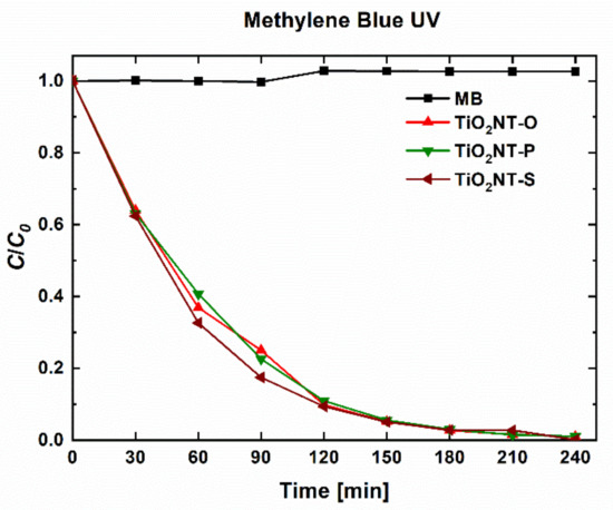 A method based on ISO 10678:2010 was used as a preliminary screening test, where the decolourisation of the solutions indicates the photocatalytic activity. The change in MB concentration after irradiation is presented in Figure 6. Complete degradation was achieved by all the three materials. This is in line with the findings of Lin et al., who reported the complete degradation of MB over similar test durations [60]. The effect of morphology on the degradation rate of MB has been studied by Pasikhani et al. [61]. The authors claim that the fastest degradation rate occurred with nanotubes with the largest aspect ratio.