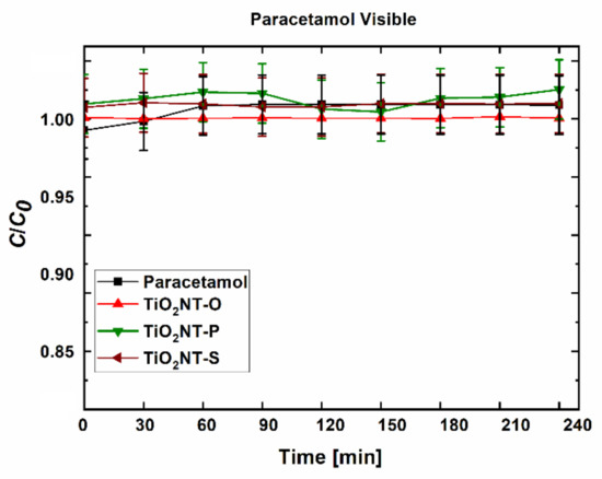 The degradation of paracetamol under visible light was used to verify the dye sensitisation mechanism (Figure 11). Since paracetamol does not absorb in the visible region of the spectrum, any reduction in concentration can be attributed to photocatalysis [69]. No reduction in concentration was recorded for any of the materials when irradiated with visible light, thus, verifying the contribution of MB towards the apparent visible light activity. The MB molecule which has significant redox activity and obtains its colouration from its conjugated structure, can easily become decolourised when exposed to a photocatalyst. On the other hand, the paracetamol molecule either requires higher light intensities, or else it cannot be oxidised by visible light using the catalysts studied in this work.