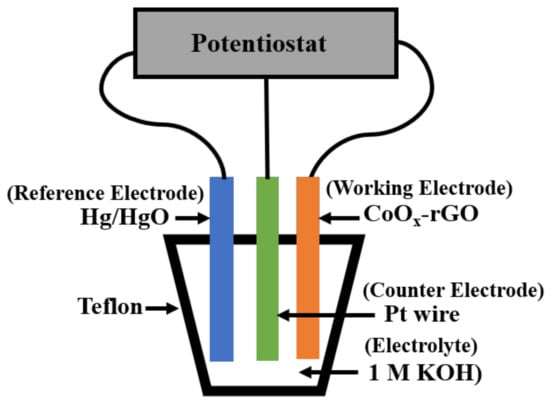 To perform the electrochemical measurements, an electrochemical workstation (Metrohm Autolab B.V., Utrecht, The Netherlands) was used with a three-electrode configuration, where the as-prepared CoOx-rGO, Hg/HgO and Pt wire were working, reference and counter electrodes, respectively. The electrochemical measurements included the cyclic voltammetry (CV), galvanostatic charge–discharge test (GCD) and electrochemical impedance spectroscopy (EIS). CV measurements were performed at different scan rates from 10 to 100 mV/s in the potential window of 0–0.6 V. The GCD tests were carried out in the same potential window and at various applied current densities. The EIS measurements were recorded in a frequency range of 100 kHz to 10 mHz with an ac perturbation signal of 10 mV. All the electrochemical measurements were carried out in 1 M KOH aqueous electrolyte in ambient conditions at room temperature (23 °C). The electrochemical measurements setup was constructed using the PTFE (Teflon) rod (McMaster-Carr, Elmhurst, IL, USA), and it is schematically shown in Figure 2.