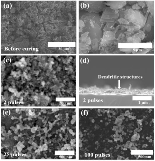 SEM images of precursor thin film sample before curing (a,b). SEM surface and cross-sectional morphology, respectively, of 2 pulses cured electrode (c,d), and surface morphology of 25 and 100 pulses cured electrodes (e,f).