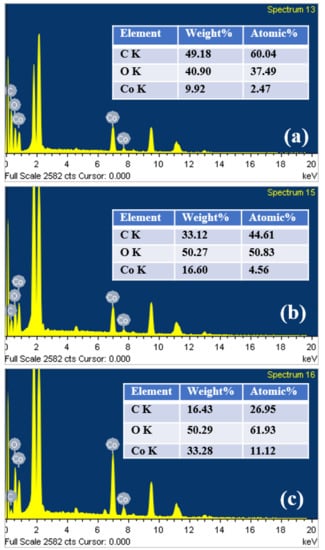 To investigate the elemental composition of the as-prepared electrodes, EDX spectra were recorded, as shown in Figure 4. It can be clearly observed that all the electrodes consist of C, O and Co elements with different atomic%. The intense peaks in the 2 keV range are associated with the substrate. Remarkably, as the number of pulses increased, the electrodes showed a significant reduction in the weight percentage of carbon. This is possibly due to the thermal evaporation of the carbon component in the films because of long-time photothermal treatment. This could be another reason why the high number of pulses cured electrodes showed poor capacitive performance (discussed later) than two pulses cured electrode.