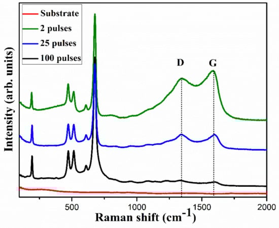 The crystalline structure of the electrodes was analyzed using Raman spectra, as shown in Figure 5. For all the electrodes, the Raman spectra showed peaks associated with vibrational modes of CoO and Co3O4. The peak centered at 190 cm−1 corresponds to F2g mode of CoO [23] while peaks centered at 478, 515, and 610 cm−1 correspond to Eg, F2g, and F2g vibration modes of Co3O4, respectively [11]. The strong peak centered at 680 cm−1 corresponds to A1g vibration mode of Co3O4 [1,11,24]. Additionally, the presence of characteristic D and G peaks, respectively, at 1344 and 1586 cm−1 confirm the presence of reduced graphitic oxide in the films [25]. The D and G peaks, respectively, correspond to the disordered carbon and the presence of graphene associated with E2g mode phonons of the sp2 graphitic carbon [26]. The presence of the highly conductive graphitic phase of carbon could help improve the performance of the electrode by reducing series resistance during the electrochemical processes [27]. In the Raman spectra, two pulses cured electrode showed strong D and G peaks compared to other electrodes, indicating a higher amount of carbon in the electrode, which agrees with the EDX spectra. The presence of weaker D and G peaks in 25 and 100 pulses cured electrodes could be due to the photothermal evaporation of the carbon component in the electrodes with irradiation of an increased number of pulses. The higher G intensity compared to D intensity is indicative of rich graphitic phase carbon in the two pulses cured electrode.