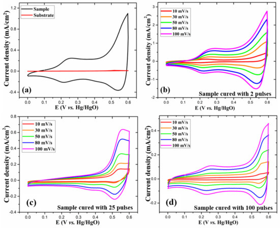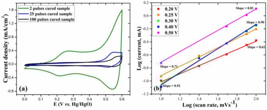 To investigate the charge storage characteristics of the as-prepared electrodes, the CV at 30 mV/s scan rate is plotted in Figure 6a. Fascinatingly, at the same scan rate, the two pulses cured electrode shows a significantly larger CV curve area than other electrodes, exhibiting its excellent electrochemical behavior and enhanced charge storage capacity. Furthermore, from the CV curves at various scan rates, the relationship between the measured current (i) and scan rate (v) can be represented by the following equations [33,34]: