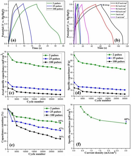 From the above equation, the areal specific capacitance at 0.40 mA/cm2 constant current density was calculated to be 17.2, 5.6, and 3.4 mF/cm2 for 2, 25, and 100 pulses cured electrodes, respectively. Similarly, we also calculated the gravimetric capacitance using Equation (1) and the 2, 25, and 100 pulses cured samples, respectively, showed the initial specific capacitance of 69, 23 and 14 F/g.