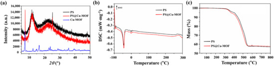 Characterization of PS and PS@Cu-MOF; (a) PXRD patterns, (b) DSC scans, and (c) TGA profiles.