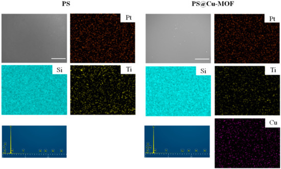 Moreover, analysis by SEM-EDS was carried out to obtain the morphologies and chemical compositions of the control PS and the PS@Cu-MOF. Figure 3 shows representative SEM images in addition to the corresponding mapping results for both species. More specifically, Si, Ti, and Pt were evenly spread throughout both networks (C and O were skipped), and the additional element of Cu was also found in the EDS spectrum of PS@Cu-MOF. These data confirm the embedding of Cu-MOF on PS following the above-described hydrosilylation reaction and agree with aforementioned PXRD patterns.