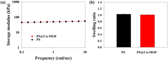 The storage moduli of PS and PS@Cu-MOF were measured to analyze their mechanical properties. As shown in Figure 4a, PS@Cu-MOF exhibited stable rheological properties (50.6 ± 0.2 kPa) and a similar modulus to PS (49.8 ± 0.3 kPa). Figure 4b shows the swelling behaviors of PS@Cu-MOF and PS, where low swelling ratios (1.01 ± 0.01 and 1.03 ± 0.03) are apparently due to the inherent hydrophobicity of PS. These results therefore indicate that PS@Cu-MOF has a polymeric network structure very similar to that of the control PS, and that the small amount of Cu-MOFs does not significantly affect the mechanical strength.