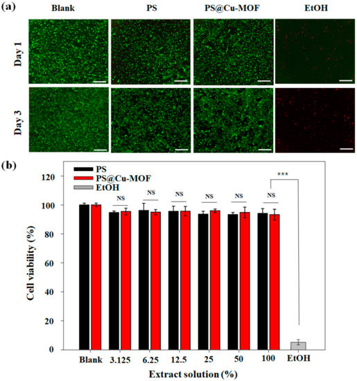Finally, we studied the cell biocompatibility of PS@Cu-MOF based on a direct contact method [47]. To verify the toxicity of the PS itself, PS (i.e., without the Cu-MOF) was prepared using the same method employed for its use as a positive control. Furthermore, as an additional positive control (blank), a mouse embryonic fibroblast (MEF) monolayer without any PS or PS@MOF contact was prepared. As a negative control, an MEF monolayer contact with a 10% EtOH solution was used. The viability of the MEF monolayer was monitored using live/dead staining as well as an MTS assay. As shown in the fluorescence microscopy images (Figure 7a), the cell viabilities for the blank, PS, and PS@Cu-MOF (100 μg⋅mL−1) samples exceeded 98% for 1 d after culture, whereas in the case of the MEF monolayer, the majority of cells died upon exposure to EtOH. It was found that the cells gradually adhered, spread, and flattened on the surface after seeding, prior to forming a confluent-like layer that survived for 3 d; this was not observed in the case of the EtOH group. These results indicate that neither the MOF-embedded PS nor the PS alone were toxic to the cells. Further quantification was carried out using an MTS assay (Figure 7b), wherein extracted cell culture medium solutions from PS and PS@Cu-MOF were serially diluted. For example, 100% refers to the original extraction medium, and 25% indicates a four times dilution from the original extraction medium. Following formation of the MEF monolayer, the culture medium was changed to the desired concentration medium containing the extract solution, and cultured. The obtained MTS results demonstrated the good cytocompatibilities of PS and PS@Cu-MOF, as the MEF viability was >93% in all cases, whereas the majority of MEFs died upon exposure to EtOH, thereby confirming the low cytotoxicity of the PS and PS@Cu-MOF extracts.