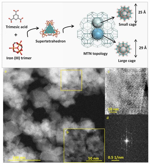 Upper panel: Schematic representation of the structure of MIL-100 (Fe) obtained by the self-assembly of iron supertetrahedra. Two cages 25 and 29 Å (small and large cage) are accessible through microporous pentagonal windows of 5 Å and microporous hexagonal windows of 8.6 Å. The structures were designed using Material Studio. Lower panel: Scanning TEM with High Annular Dark Field Mode (STEM-HAADF) images of MIL-100(Fe) nano Metal-Organic Frameworks (MOFs), (a) unprocessed image, (b) magnified image, (c) inverse FFT filtered STEM-HAADF image, and (d) FFT pattern which reveals the crystallinity of the particles. The ultrahigh resolution of STEM-HAADF shows the ordered porous structure of submicron particles.