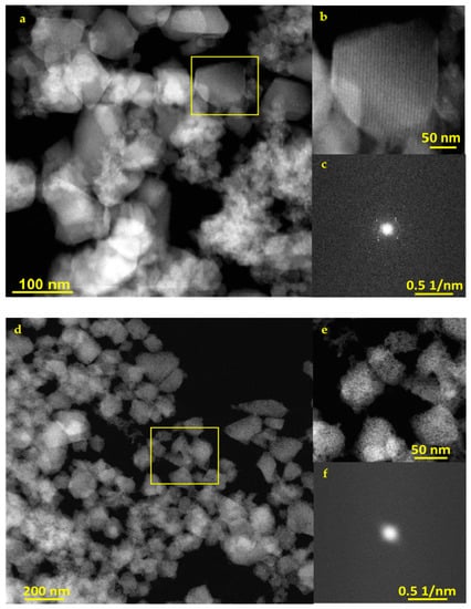 (a,b), STEM-HAADF images of degraded MIL-100(Fe) nanoMOFs in PBS (pH = 5.4) (d,e) in PBS (pH = 7.4) (c,f) FFT patterns of MIL-100(Fe) nanoMOFs in PBS pH = 5.4 and pH = 7.4, respectively.