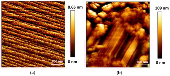 Topography of (a) microMOF (+) crystal and (b) a microMOF (−) crystal in water (128 pixels × 128 pixels). AFM mapping presents ordered crystalline planes typically observed for microMOFs (+) and some defects in the case of microMOFs (−).