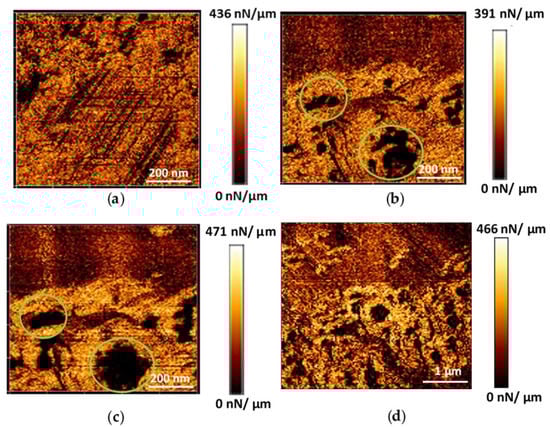 AFM images (stiffness map) (128 pixels × 128 pixels), of a microMOF (−) crystal in water at time 0 (a), in PBS pH = 7.4 at time 0 (b) and after 2 h at different magnifications (c,d). Defects that are progressively enlarging during degradation are surrounded with green circles.