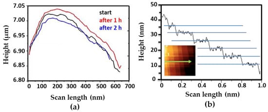 In contrast to electron microscopy techniques that generate images of a sample surface in two dimensions, AFM can measure the vertical dimension (z-direction), enabling quantitatively accurate calculations of sample’s height. To investigate dimensional changes of microMOFs upon degradation, height profiles were plotted. The typical profile is shown in Figure 6. In the case of microMOFs (−) (Figure 6a), regions were selected to include both crystalline regions and defects on the crystal. Surprisingly, the changes in height after 2 h of incubation in PBS at pH = 7.4, were less than 0.1% of the initial crystal size, indicating no dimensional changes. This result is in agreement with previous studies undertaken by Raman microscopy-spectroscopy showing no dimensional changes of microMOF (−) upon degradation in PBS at pH 7.4 []. This behaviour could be possibly attributed to the formation of a passivation layer. Following the height measurements for microMOFs (+), it was interesting to calculate the observed well defined crystal planes, in the presence of acidic PBS. The average value of plane distance was calculated and found at at 4.5 ± 0.3 nm. Remarkably, these values are in strong correlation with the results by STEM-HAADF for nanoMOFs, corresponding to the {111} crystal planes of MIL-100(Fe) of 4.23 nm.