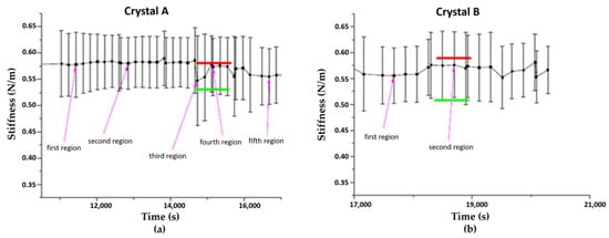 Comparison of the measured stiffnesses of different regions randomly chosen on two crystals named A (a) and B (b), in PBS at pH = 5.4. Results were averaged over regions of 1 μm2.