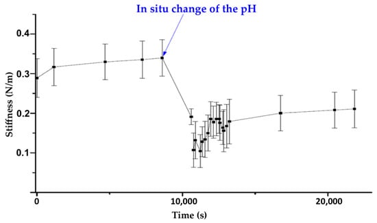 Stiffness profile of the evolution of the measured stiffness of a microMOF (+) particle following the addition of KOH.