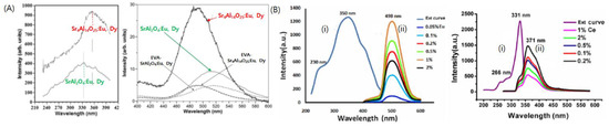 Photoluminescence spectra for lanthanide doped strontium aluminate phosphors (A) Photoluminescence excitation (left) and emission (right) spectra for SrA2O4:Eu2+,Dy3+ and Sr4Al14O25:Eu2+,Dy3+. Reprinted from [61] with permission from Elsevier. (B) Photoluminescence excitation (i) and emission (ii) spectra for SrA2O4:Eu2+ (left) and SrA2O4:Ce3+ (right). Adapted from [30] under Creative Commons Attribution (CC BY) license.