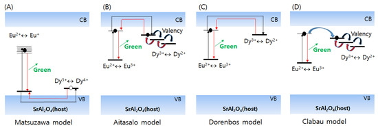 The first of these models was proposed by Matsuzawa et al. [5]. Briefly, the model involves the generation of a hole during Eu2+ excitation and subsequent Eu+ formation, subsequent release and migration of the hole to Eu+ through the valence band at a high temperature, and generation of Eu2+ in the excited state; a photon is also subsequently released from the excited Eu2+. In this model, Dy acts as a hole-trapping center by localizing the holes released from Eu2+, and it facilitates the conversion of Dy3+ to Dy4+. Therefore, the hole release and migration from the trapping centers to Eu+ is crucial to determining the afterglow. However, the main problem in this model involves the energetically unfavorable formation of Eu+.