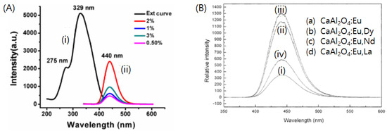 Calcium aluminates belong to the spinel group of minerals, similar to the other alkaline earth aluminates. The typical chemical representation of calcium aluminate is CaAl2O4, and it exists in the monoclinic or orthorhombic forms [83]. As discussed earlier, the host crystal structure and activator are the important factors for determining the main emission peaks of aluminate-based phosphors. For example, CaAl2O4:Eu2+ is known to exhibit blue light emission, which corresponds to a shorter emission wavelength in the SrAl2O4:Eu2+ system. Among the various lanthanide-doped calcium aluminate phosphors, CaAl2O4:Eu2+ is extensively used as a phosphor material (Figure 3). As an emission center, Eu2+ is known to emit blue light via the 4f65d → 4f7 transition, whose peak is located at ~442 nm [78]. Its absorption is observed at near-UV light, which is similar to that via LED chips. Although there are fewer studies on CaAl2O4 phosphors than those on SrAl2O4, the former has attracted considerable recent interest as a luminescent host owing to its high color purity and stability; it also meets the high-efficiency-based requirements for novel blue-emitting phosphors [84].