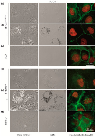 Optical imaging of SCC-9 cells incubated with SPIONs in the presence and absence of external magnets. Cells were treated with (a,b) SPIONLA-HSA and (d,e) SPIONLA (100 μgFe/mL) in the presence (+) or absence (−) of a magnet, or with the corresponding amount of (c) H2O or (f) DMSO (final concentration of 2%) for 48 h and visualized by phase contrast (first column), DIC (middle column) or fluorescence staining of nuclei (Hoechst 33342, red) and actin cytoskeleton (Alexa Fluor 488 Phalloidin, green) (last column). Abbreviations: SPION, superparamagnetic iron oxide nanoparticles; SPIONLA, lauric acid-coated SPIONs; SPIONLA-HSA, lauric acid- and human serum albumin-coated SPIONs; DIC, differential interference contrast; DMSO, dimethyl sulfoxide.