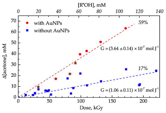The acetone concentration was determined by optical absorption measurements at 265 nm using an extinction coefficient of 15.4 M−1 cm−1 (Figure S3) in the supernatants of AuNP suspensions (see Section 2 for details). The acetone’s radiolytic formation yield was determined from acetone concentration dependence versus the applied dose (Figure 1). In this experiment, the applied dose was relatively high (up to 220 kGy) to accumulate a measurable quantity of acetone.