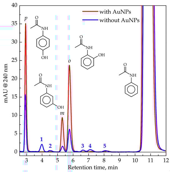 The •OH radical can not only cause H-abstraction, but it also could form an •OH adduct. Therefore, to study the catalytic effect of AuNPs on such a type of reaction, we chose acetanilide hydroxylation by •OH, which is similar to other aromatic systems. It includes the following steps: attachment of •OH to a benzene ring forming an adduct and the loss of an electron, followed by the loss of H+, forming a stable hydroxylated molecule (Scheme 2) [,]. In this reaction, numerous products are formed. Herein, we focused on three main products: hydroxyacetanilide with a hydroxyl group in ortho, meta, para positions, and acetanilide consumption (Figure 2).