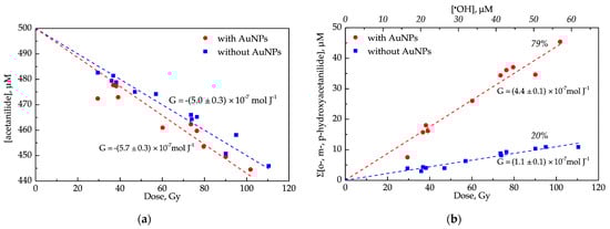 Analysis of 0.5 mM acetanilide aqueous solution (blue squares) and 0.5 mM of acetanilide in AuNPs’ suspension with 6 nM particle concentration (red dots) irradiated at various doses by gamma rays. (a) The disappearance of acetanilide; (b) the formation of ortho, meta, para-hydroxyacetanilide. All samples were saturated with N2O by bubbling. Radiolytic yields (G) are determined from linear slopes. Reaction yields are calculated as a percentage of •OH concentration.