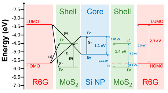 To date, many studies have demonstrated that the SERS mechanism of using 2D semiconductor material is CM and mainly due to charge transfer (CT) process happening on the interface between the molecule and the semiconductor [34,35,36,37]. There are two CT paths between molecule and semiconductor. One is that the electrons in the highest occupied molecular orbital (HOMO) of the molecules absorb enough light energy and then jump to the adjacent semiconductor conduction band to form free electrons, leaving a hole in the HOMO and forming an electron-hole pair, so called exciton. The other is that the electrons in the valence band of the semiconductor transit to the lowest unoccupied molecular orbital (LUMO) of the molecules. A schematic band diagram of the CT process between the R6G and the Si/MoS2 core-shell NP arrays is presented in Figure 5. The figure suggested that the electrons excited were transferred to a higher energy state upon absorption of light with a photon energy exceeding the energy differences via the possible transition paths (1)–(6), including (1) the HOMO of R6G to the conduction band of MoS2, (2) the valence band of MoS2 to the LUMO of R6G, (3) the HOMO of R6G to conduction band of the Si NP, (4) the valence band of Si NP to the LOMO of R6G, (5) the indirect energy gap of MoS2, and (6) the indirect energy gap of the Si NP. The corresponding energy difference is (1) 1.2 eV, (2) 2.5 eV, (3) 1.65 eV, (4) 1.75 eV, (5) 1.4 eV, and (6) 1.1 eV, respectively. Since the energy difference in path (2) is about 2.5 eV, which is larger than the photo energy 1.96 eV of the excited laser (~633 nm) we used in this study, the transition through path (2) could not happen. We believe that the opportunities of the transition path (3) and (4) are extremely low because the electrons excited via the paths have to spend much energy to pass through the thickness of MoS2 except for the R6G molecule that directly contacts the Si NP through the cracks on the surface of MoS2. Furthermore, the laser energy could penetrate either the R6G or MoS2 layers to excite electrons in the MoS2 thin film and Si NP during the SERS measurement process, leading to the path (5) and (6) related to the internal transition of indirect band gap. Therefore, the main reasons for the SERS enhancement mechanism of the Si/MoS2 core-shell NP arrays in the detection of R6G molecules may be attributed to CT process of path (1) and the exciton transitions of path (5) and (6). In comparison with the planar MoS2 thin film, we suggest that the Si/MoS2 core-shell NP arrays with higher surface-to-volume ratio could absorb more R6G molecules effectively and increase larger interface area between MoS2 and R6G. The larger interface area would further promote higher opportunity in CT and exciton resonance, leading to the enhancements R6G signals in SERS analysis. In the future, we would arrange systematically further optical experiments based on this result to understand the contribution and proportion in the SERS enhancement in terms of CT process and exciton transitions.