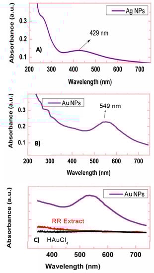 The formation of silver and gold nanoparticles was monitored by UV-Vis measurement of the reaction solution (see Figure 1A–C). The strong absorption in the UV range between 200 and 400 nm is due to the presence of methanol and organic compounds in the extract of Rumex roseus. A similar finding was found for other plant extracts during the synthesis of AgNPs and AuNPs [15,31]. At higher wavelengths, the adsorption is due to the plasmonic peak of Ag and Au nanoparticles because no adsorption in this range was noted for the RR plant extract and metal precursors.