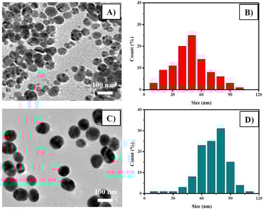 TEM analysis was performed to determine the size and shape of the obtained Ag and Au nanoparticles. The round shape of Ag nanoparticles, foreseen by UV-Vis analysis, was also confirmed by TEM analysis (see Figure 2A). The average diameter of AgNPs was calculated to be 50 ± 45 nm. For the AuNPs sample, larger particles with a round shape and an average diameter of 75 ± 30 nm have been found (Figure 2B). The particle size distribution for both samples, derived by counting an elevated number of particles (>150), is reported in Figure 2C,D.