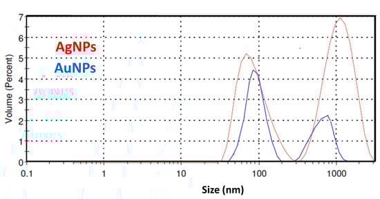 DLS was also used for analyzing the size distribution of the synthesized Ag and Au nanoparticles in aqueous suspension. Differently from UV-Vis and TEM data, by this technique, we can determine the secondary particle size of nanoparticles dispersed in a specific polar or non-polar solvent [38]. DLS spectra of AgNPs and AuNPs redispersed in the aqueous solution are shown in Figure 3. The plot shows the volume (percent) of particle light scattering against particle size. The two distinct peaks observed at 74 and 1100 nm clearly indicate a bimodal distribution, signaling the polydispersities of the AgNPs in the aqueous dispersion.