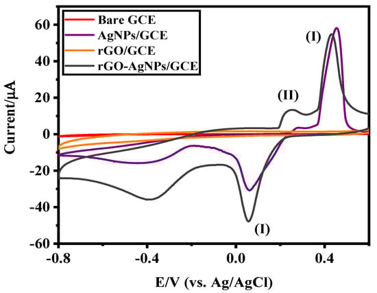 Cyclic voltammograms (CV) of bare GCE and rGO-, AgNPs- and rGO-AgNPs-modified GCEs in the presence of 300 µM H2O2 in 0.1 M phosphate buffer solution (PBS) (pH 7.0) and (I) denotes the reaction of formation of AgO and (II) denotes the formation of Ag2O during the potential scan.