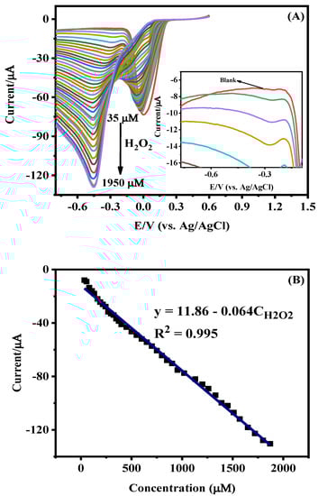 Cyclic voltammetric studies with rGO-AgNPs-modified GCE were carried out for various concentrations (35 to 1950 μM) of 1 mM H2O2 at pH 7.0. CVs recorded after applying baseline correction are shown in Figure 7A. The peak observed at 0.03 V, corresponding to the reduction of Ag, was found to decrease its intensity with the increase in the concentration of H2O2. Initially, the reduction peak of H2O2 appeared at −0.28 V for lower concentrations of 35 µM to 400 µM, and the peak intensity increased with the increase in the H2O2 content and reached the maximum at 1950 μM. Moreover, a small but systematic negative shift in the peak potential was also observed as a function of the H2O2 content. This behavior can be explained as follows. Actually, the observed cathodic peak current is a direct measure of the rate of the electrochemical reaction taking place at the electrode surface. At low concentrations of the analyte, mass diffusion occurs steadily, but at high concentrations, the diffusion process is disrupted due to the deposition of reaction products of H2O2 on the electrode surface. In this condition, the electrochemical system requires higher potential, resulting, therefore, in the shift in the peak potential from −0.28 to −0.45 V with the increase in H2O2 concentration.