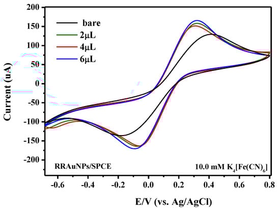 First, we evaluated the effect of AuNPs on the electrochemical characteristics of the bare SPCE platform by cyclic voltammetry (Figure 10), by using ferrocyanide (10 mM K4[Fe(CN)6]) as a probe, in 1 M phosphate buffer solution (PBS) at a scan rate of 50 mV/s. CVs of modified AuNPs/SPCE show the characteristic redox couple of ferrocyanide which appears to be increased in intensity compared to bare SPCE; furthermore, the peak difference is somewhat reduced (354 mV), suggesting that AuNPs help the electron transfer reaction and also favor the redox reaction. As regarding the AuNPs’ loading, a volume of 2 µL of AuNPs (having a concentration of 5 mg/mL) dipped in SPCE has been demonstrated to be sufficient in order to obtain the maximum response. By considering the result obtained, the SPCE modified with 2 µL of AuNPs solution was used in the subsequent experiments.