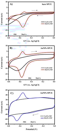 Electrochemical behavior of (A) bare SPCE and (B,C) AuNPs-modified electrode in the absence and presence of riboflavin. CV was performed in de-aerated 1 M PBS at a scan rate of 50 mV/s. The arrows indicate the direction of the starting potential scan.