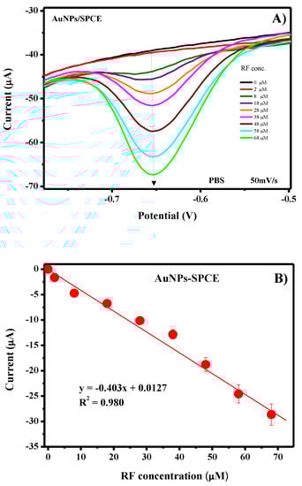 (A) Linear Sweep Voltammetry (LSV) of AuNPs/SPCE, performed in 0.1 M PBS electrolyte and in the presence of different concentrations of RF. (B) Calibration curve for the determination of RF. The standard deviation of response calculated from data in the calibration curve is 7.623.