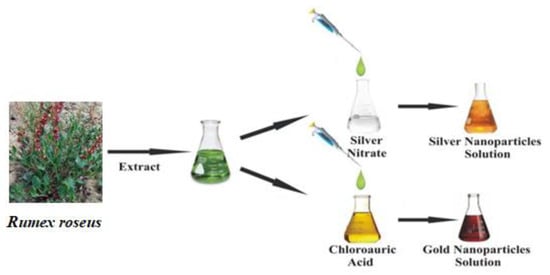 The procedure for the preparation of Ag and Au NPs is illustrated in Scheme 1. First, the methanolic extract of Rumex roseus was obtained following the procedure reported in our previous work [16].