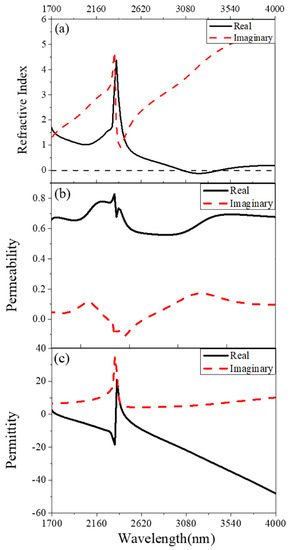 Simulation results of transmittance and reflectance of the above fishnet structure are shown in Figure 2. At the wavelength of around 2300 nm (the yellow arrow in Figure 2), there are an obvious valley of the reflectance curve and a peak of the transmittance curve. The reflectance curve shows two slight valleys at the wavelength of about 2100 nm (the red arrow in Figure 2) and 3220 nm (the green arrow in Figure 2). As shown in Figure 3, optical constants like the refractive index, permittivity and permeability were retrieved by the above improved analytical method from the reflectance r and transmittance t. NRI was achieved around the valley from 3076 nm to 3390 nm, with the minimum value of −0.12 at 3225 nm. This paves a way for the real application, such as super diffraction imaging in the mid-infrared band, of fishnet metamaterials placed on a substrate. Between 1700 nm and 2300 nm, there is also a valley in the curve of refractive index. However, the minimum value of the valley is larger than zero. The two valleys result from magnetic resonances (Figure 3b). The valleys at the longer wavelength along with a more negative permittivity generated NRI. At around 2300 nm, there is a peak in the curve of refractive index. This corresponds to the electric resonance (Figure 3c), which induces an anti-magnetic resonance. The anti-magnetic is not wanted because it induced an increased refractive index.