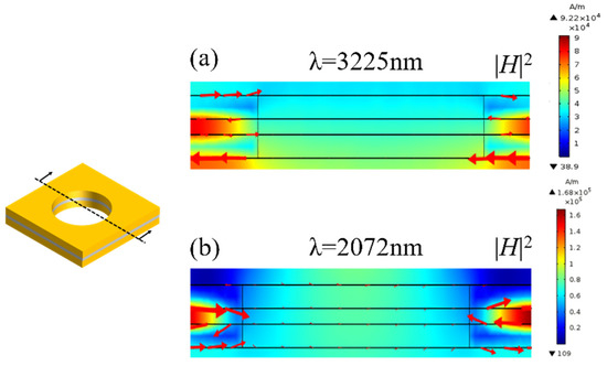 The magnetic field of the fishnet structure in the x-z plane in the resonant region of λ = 3225 nm (a) and λ = 2072 nm (b) (the arrow shows the direction of the current).