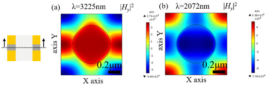 (a) The magnetic field distribution at λ = 3225 nm, (b) the magnetic field distribution at λ = 2072 nm in the x-y plane of the middle of MgF2 layer (z = 0).