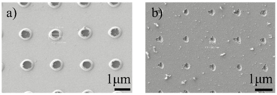 Figure 11a,b shows the fs laser ablated geometry of periodic nanoholes in Au layer, and MgF2 layer, respectively. As shown in Figure 11a, there are large areas of fused ring around the nanoholes in Au layer, forming an unclear boundary between the holes and the surface. It mainly results from thermal melting rather than stress break. The minimal diameter of holes can be 500 nm. Two temperature model can explain the formation of holes with fused rings. For a short laser pulse, the pulse duration can be less than the relaxation time, that is τ < τep, where τ is the laser duration, and τep is the relaxation time (the electron-phonon scattering time). During the pulse duration, the temperature of free electrons and the lattice are different and independent [26,27]. Free electrons absorb energy from the electric field. After the relaxation time, electrons transfer energies to the lattice by electron-phonon scattering. Most of the laser energy is taken away by the metal vapor, leaving a little energy in the lattice. The left energy brings out thermal diffusion, causing the formation of melting edges.