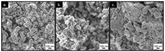 The hydrothermal synthesis of HZSM-5 and influence of hexadecyltrimethoxysilane (HDTM) on nanocrystal aggregation was first investigated for uncalcined materials. FESEM imaging (Figure 1a–c) revealed a “cauliflower-like” morphology for as-synthesized h-HZSM-5 and c-HZSM-5, comprising fused primary nanocrystals [36]. In contrast, commercial HZSM-5 comprised large irregular crystallites with a wide particle size distribution [37].