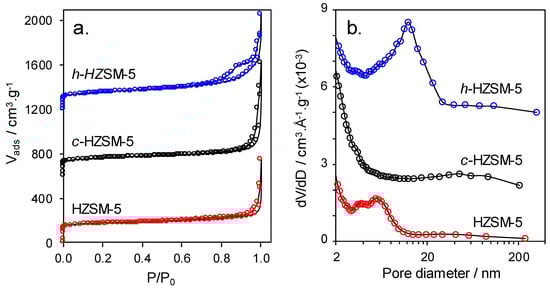 Textural properties of the calcined zeolites were subsequently determined by N2 porosimetry (Figure 4). Adsorption-desorption isotherms of calcined h-HZSM-5 (Figure 4a) were intermediate between type II or IV, with an inflection point starting around P/P0 = 0.8, and hysteresis in the desorption branch associated with interparticle mesopore voids formed during directed aggregation of silanized particles (absent in commercial HZM-5 and c-HZSM-5) [25]. All samples exhibited similar BET surface areas (Table 2), comparable to those reported for hierarchical nanozeolites [25], although the h-HZSM-5 exhibited the least microporosity and a significantly higher mesopore volume than the commercial zeolite [41].