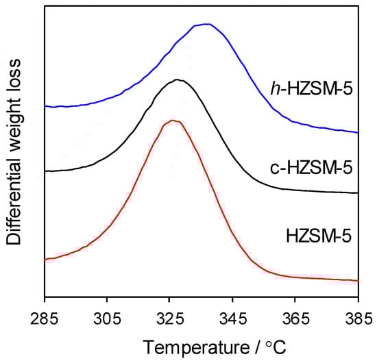Acidity was characterized by TGA of chemisorbed sec-butylamine, whose decomposition liberates butene (Figure 5) and ammonia, where increased acid strength leads to a decreased decomposition temperature [42]. Reactively-formed butene desorbed with peak maxima of 329 °C for commercial HZSM-5 and c-HZSM-5, consistent with similar, moderate strength acid sites. A slight increase in the butene peak maximum (to 339 °C) observed for h-HZSM-5 indicates slightly weaker acidity, a possible consequence of additional Si incorporated during HDTM silanization [21]. However, h-HZSM-5 exhibited the highest acid loading, which may reflect improved acid site accessibility by the bulky amine probe molecule to the internal mesopore network of the hierarchical structure.