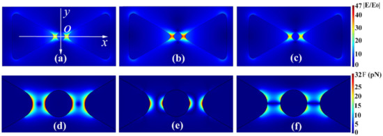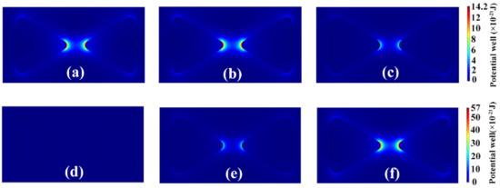 The calculated trapping potential reaches 14.2 × 10−21 J at the working wavelength of 560 nm, which is three times larger than the Brownian motion energy taken as KBT. In order to achieve higher stability of plasmonic trapping, an amplified laser field is usually required in order to increase the light-force conversion efficiency to overcome Brownian motion. We observed that the plasmonic trapping potential exhibits dramatic enhancement with increasing laser electric field from 2 × 106 V/m to 4 × 106 V/m and 6 × 106 V/m, as in Figure 2d–f, respectively. When the laser electric field is at 2 × 106 V/m, the trapping potential well becomes insignificant and disappears in the bowtie gap (Figure 2d). The enhanced trapping potential reaches 57 × 10−21 J at the laser electric field of 6 × 106 V/m (Figure 2f), which is 12 times larger than KBT. This indicates that the trapping potential can work well to overcome the Brownian motion of the Au sphere for stable trapping of the Au sphere target via amplifying the laser field. These results could be fundamentally important for a good understanding of the optimization of laser excitation parameters for obtaining stable plasmonic trapping in bowtie antennas for specific quantum-dot-scale optical trapping applications. In recent years, experimental studies have shown that more abundant optical and electronic properties can be explored for nanoparticle-decorated triangles for potential applications in SERS and hot carrier devices [28,29]. Experimental advancements would significantly accelerate the development of plasmonic trapping applications in a wide range of experimental and industrial fields.