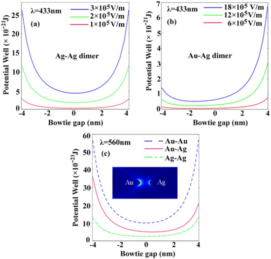 The plasmonic trapping potential well distributions in the x direction along the gap of the homogenous and heterogeneous dimer geometries for different laser electric fields are shown in Figure 3. It can be seen from (a) that the plasmonic trapping potential distribution exhibits symmetry across the gap of the homogenous Ag–Ag bowtie at the excitation wavelength of 433 nm. The 433 nm excitation wavelength is selected to improve the trapping robustness compared to the 410 nm resonance wavelength, but simultaneously brings about the sacrifice of trapping potential value. The maximal trapping potential of 27 × 10−21 J appears in close proximity to the inner bowtie tips at the excitation wavelength of 433 nm, which is five times larger than KBT, at a laser field of 3 × 105 V/m. The smaller laser field amplitudes of 2 × 105 V/m and 1 × 105 V/m all lead to lower trapping well potential for the plasmonic bowtie antennas. However, we find that the trapping potential symmetry has nothing to do with modifying the applied laser field. We can see from Figure 3b that the potential symmetry is substantially broken for the heterogeneous Au–Ag bowtie dimer at the excitation wavelength of 433 nm. More interestingly, we can see that the trapping potential becomes more asymmetrical at the larger laser electric field of 18 × 105 V/m. It can be explained by dominant plasmon hybridization originating from the heterogeneous noble dimers. The hybrid plasmon causes an asymmetric electric field gradient, leading to asymmetrical trapping potential across the bowtie’s gap. To explore the symmetry-tunable properties for robust plasmonic trapping, we further carried out comparable investigations on the potential well for Au–Au, Au–Ag, and Ag–Ag dimers. It can be seen from Figure 3c that a strong symmetrical potential well is observed for the Au–Au dimer at a resonance wavelength of 560 nm. A 2-D image of the symmetry-broken trapping potential distribution for the heterogeneous Au–Ag bowtie dimer is shown as an inset in Figure 3c. The potential well is dominantly concentrated at the region close to the Au tip, indicating that the Au plasmon resonance is playing a role at a wavelength of 560 nm. However, the weakest plasmonic trapping potential appears at the Ag–Ag bowtie dimer due to the off-resonance laser excitation at the excitation wavelength of 560 nm, which is typically deviated from the plasmon frequency of Ag. Note that the Au–Ag bowtie dimer always exhibits a moderate potential well with symmetry-broken distribution. This work could be helpful in developing our understanding of symmetry-tunable plasmonic nano-tweezers for stable and robust plasmonic nano-trapping applications.