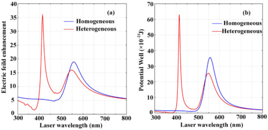 The electric-field enhancement spectra (a) and wavelength-dependent plasmonic potential well (b) for the homogeneous Au–Au and heterogeneous Au–Ag dimers. The bowtie edge length is 20 nm, the bowtie gap is taken as 10 nm.