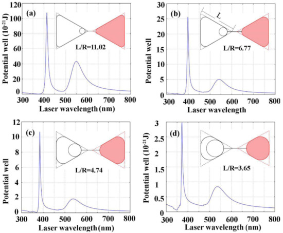 The plasmonic trapping potential tunability with respect to the edge/tip rounding of the heterogeneous Au–Ag bowtie dimer is shown in Figure 5. Here, the aspect ratio of edge/tip rounding is defined as the ratio of L/R, where L means the length of triangle edge side as seen in Figure 5b, and R is the radius of tip rounding. In this simulation, we fix L at 23.7 nm and only change the radius of tip rounding to adjust the ratio of L/R. We can see from Figure 5a that the dual-peak spectrum is significantly enhanced for the designed bowtie geometry with the edge/tip ratio of 11.02, in which the bowtie tip radius is taken as 2.15 nm. The smallest trapping potential at a wavelength of 549 nm reaches a maximum of 43 × 10−21 J, larger than 10.4 KBT. This indicates that the trapping potential generated at the designed bowtie dimer with the edge/tip ratio of 11.02 could be qualified for the stable trapping of nano-targets in practical applications. It can be seen that the trapping potential can be successively weakened by decreasing the edge/tip ratio from 6.77 (Figure 5b), to 4.74 (Figure 5c), to 3.65 (Figure 5d), which corresponds to tip radii of 3.5 nm, 5 nm, and 6.5 nm, respectively. However, the maximum plasmonic trapping potential of 3 × 10−21 J (0.7 KBT) would be ineffective for the edge/tip ratio of 3.65 (Figure 5d). It should be emphasized that the spectrum exhibiting definitive blue-shift with decreasing edge/tip ratio enables optimization of the trapping potential for possible applications. Additionally, the other structural control parameters could have an important influence on the plasmonic optical trapping. More results indicating the influence of structural control parameters on the plasmonic trapping are shown in Figure S1 in the Supplementary Materials. We believe that various building geometries are very important for understanding the choice of appropriate excitation wavelengths. We also calculated the optical properties of Au nanosphere, single Au triangle, and Au–Au bowtie dimer, as shown in Figure S2 in the Supplementary Materials.
