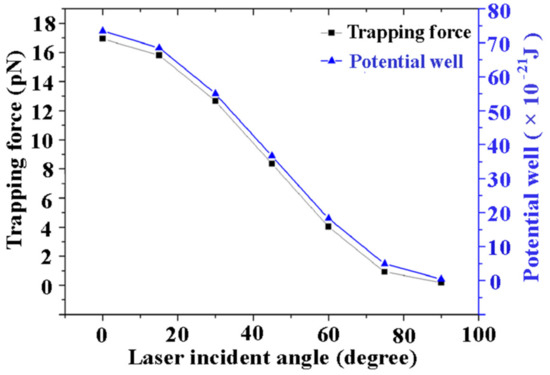 The trapping force exerted on Au nanospheres of a bowtie dimer and the corresponding potential well with respect to the incident angle of the laser. The Au sphere diameter is 10 nm here. The bowtie edge length is 40 nm, the bowtie gap is taken as 20 nm. The trapped 10 nm Au sphere is considered here.