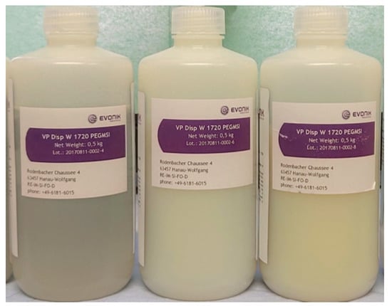 Nanostructured products from Evonik Industries AG were used for oil recovery experiments in this work. The nanostructured materials were supplied as special research and development (R&D) laboratory products, hereafter simply referred to as nanoparticles. They were supplied to us in small containers as AERODISP®, which is AEROSIL® particles in liquid solution as shown in Figure 2. They are spherical and amorphous products mainly composed of silicon dioxide (SiO > 98.3%); additional components are aluminium oxide (AlO) and mixed oxides (MOX). The surface of NPs were coated with Poly (methacrylate) based molecules to improve dispersion stability and lower the hydrophilicity nature that characterizes typical silica materials to form polymer-coated/functionalized nanoparticles. Properties of the particles are given in Table 1. The size of the nanoparticles was measured using the dynamic light scattering technique.